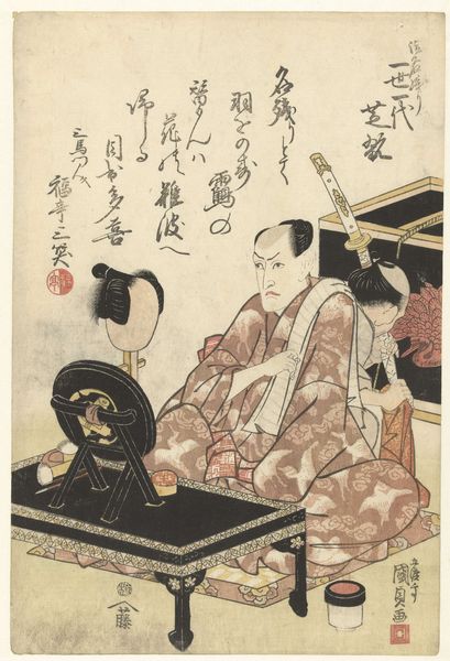 Editor: Here we have "Memorial Portrait of the Actor Nakamura Utaemon IV," a woodblock print by Suiho Henjin, dating back to 1852. I'm struck by the somewhat subdued, melancholic atmosphere. What stands out to you in this piece? Curator: Immediately, I'm drawn to the materiality. Consider the woodblock printing process itself. Each line, each color plane, required skilled labor. The layering of inks, the specific types of wood used for the blocks – these details were consciously chosen to convey meaning. Look closely, and you begin to imagine the artisan's hand at work. Editor: That’s interesting; I hadn't thought about the labor involved. So, you see beyond just the image itself? Curator: Absolutely. The choice of Ukiyo-e style isn't arbitrary. These prints were often mass-produced and widely consumed. Memorial prints like this served a dual purpose: honoring the deceased actor, of course, but also participating in the wider system of celebrity culture and artistic consumption of the Edo period. The print functioned as a commodity, its value intertwined with both artistic skill and popular appeal. Do you see this at play? Editor: I can see that. It makes me think about celebrity culture today. We create images, we share and sell. What is this process called, again? Curator: Ukiyo-e refers to pictures of the floating world. It often portrayed the entertainment quarters, showcasing celebrities from that era like Kabuki actors. The process in question involves transferring designs onto wood, meticulously carving away non-image areas. The raised surfaces are then inked, and paper pressed against the block captures the image. Think of the many impressions made. Now, think of distribution. Where does this connect? Editor: So, from the start this portrait of Nakamura was made to circulate, to be used up... like a product of sorts. It makes you rethink the very act of mourning, almost like another consumer trend. Curator: Precisely! The material reality shapes our understanding of even the most seemingly personal emotions. Looking at it, one understands this duality of human interest with material realities. Editor: I see that! Thanks so much for pointing that out; I feel like I understand the print better now. Curator: Likewise! Understanding the work enriches our appreciation, deepening engagement for all!