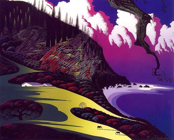 Kenny Scharf created "Agua Pollination" as an invitation to explore the convergence of organic and artificial realms. The painting strikes us with its symmetrical composition and the use of vibrant, airbrushed colours. Scharf arranges surreal mountainscapes populated with cartoonish figures. The mountains, rendered in fluid, organic forms, are juxtaposed with the hard-edged, geometric shapes of the whimsical creatures. This contrast destabilizes the traditional understanding of landscape, blending natural elements with pop-art aesthetics. Notice the repeated, looping patterns in the sky. These function as visual signifiers, perhaps alluding to the interconnectedness of all things within Scharf's invented ecosystem. The waterfall, a focal point, not only anchors the composition but also acts as a semiotic emblem for transformation and renewal. Through this formal interplay, Scharf challenges our perceptions, inviting us to reconsider the boundaries between the natural and the artificial. The painting serves as a reminder that meaning is not fixed but emerges from the dynamic interplay of forms and ideas.