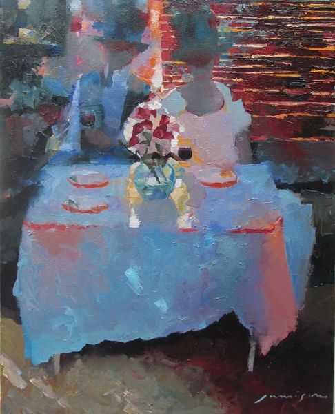 Curator: Looking at Jeff Jamison's "The Student", rendered in oil paint, the initial feeling I get is one of blurry motion, like a fleeting glimpse into another world. Editor: I am drawn to the gendered implications in the title "The Student". It conjures questions around labor, service, and class, especially when viewed through a feminist lens. Who is this person? Are they working to sustain their studies? Curator: Yes, I notice the checkerboard pattern of the floor and how it provides a spatial foundation, or perhaps suggests disorientation? There's an interesting tension created by the flatness of certain planes juxtaposed against the depth implied by the perspective. The use of color is restrained, almost muted. Editor: The space, seemingly a cafe or restaurant, becomes a stage for examining the societal role and expectations placed on students— often juggling education with financial precarity. It speaks to the intersectionality of student identity with broader capitalist systems of exploitation. Curator: Observe how the composition, especially in its brushstrokes, draws your eye to the activity near the bar and then the strong horizontals, how it controls the whole painting. The surface qualities are luscious but somehow feel very spontaneous and fleeting. Editor: It's tempting to consider the painting through the lens of urban alienation—a common theme in modernist art. Perhaps this individual symbolizes the experience of many students navigating a complex and demanding cityscape while battling socio-economic inequality and struggling to forge identities and paths for their lives. Curator: The composition really does work—a series of loosely structured blocks of dark and light that create the overall picture. It almost hovers on the brink of abstraction but resolves into a figurative form. Editor: This artwork can ignite much needed dialogues on privilege, opportunity, and the lived experiences of those striving to build a future against persistent systemic obstacles, a pertinent narrative in today's society. Curator: The overall effect of the blurry yet firm construction provides visual strength and insight that speaks for itself. Editor: Exactly, now I wonder about other works within a larger discourse on the struggles of young people within this cultural landscape.