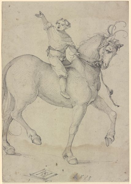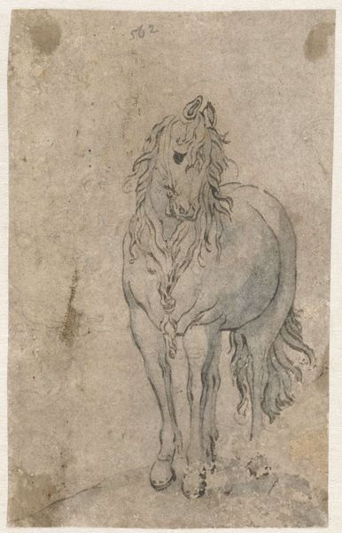 This drawing of a horse rearing up on its hind legs was made anonymously, on blue paper, with white chalk. It is an image that invokes the social history of horsemanship. Horses and their riders have always been an indication of status. In aristocratic societies, like Renaissance Italy, to be seen in control of such a magnificent animal was a sign of wealth, power, and nobility. The rearing horse is associated with military power, representing the peak of its training. The social life of the court was often expressed through the imagery of war. It is a symbol of controlled, noble violence. However, given that the artist is anonymous, perhaps this study was made at an academy, as a technical exercise. In this context, the drawing is a celebration of the institution that trains artists, rather than a commentary on the use of horses in the aristocratic world. Without further information, it's hard to determine the artist's intentions, which is why social art historians rely on institutional records and historical context.