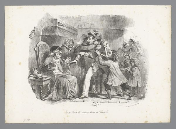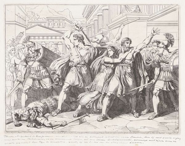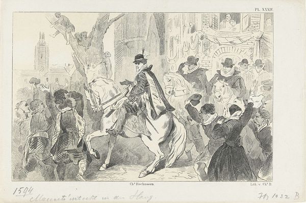 Editor: So, this is "De Brugsche vrouwen dwingen hare mannen om zich aan Graaf Lodewijk te onderwerpen", or "The women of Bruges force their men to submit to Count Louis," a 19th-century engraving. It's incredibly detailed and lively. The expressions are very intense! What symbols or underlying meanings do you see here? Curator: The engraving captures a potent visual trope, the strength and agency of women challenging male authority. The scene is rich with layered symbolic gestures. Look at how the women physically restrain the men; they are disarming them, quite literally and metaphorically. What does that disarming represent, do you think? Editor: Maybe a disruption of the expected social order, roles reversed during a time of conflict? Curator: Precisely. It invokes not only a specific historical moment, but also speaks to the enduring power dynamics present in society. Notice how clothing signifies class but emotion transcends this; fear, anger, determination are all vividly on display regardless of station. And what about the children present, clinging to the adults? Editor: They seem to add a layer of vulnerability, a reminder of what’s at stake. Almost like little reminders of the future these women are trying to protect? Curator: Yes, precisely that sense of continuity! This historical event, mediated through the engraver's hand, carries the cultural memory forward. The symbols communicate defiance but also societal anxieties and hopes for stability through resistance. Ultimately, it serves as a meditation on the evolving roles we all play. Editor: It's fascinating to think about how one image can encapsulate so many ideas about power and gender and how those dynamics endure across time. Thank you! Curator: Indeed! Every viewing adds nuance.