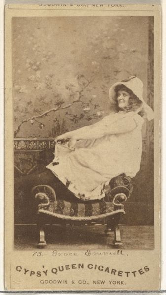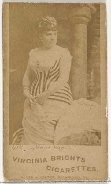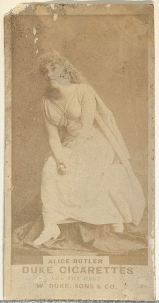 Curator: At first glance, there’s something dreamlike about this piece, it is softened and delicate. It’s an albumen print called "Edith Kingdon, from the Actors and Actresses series (N45, Type 1) for Virginia Brights Cigarettes," created by Allen & Ginter sometime between 1885 and 1891. Editor: Ah, yes, that aged quality definitely lends to a nostalgic haze. It speaks to a very specific bygone era of theatrical celebrity. It feels like the kind of image that would be slipped into a love letter. Curator: Exactly! And that association is really no accident, considering the purpose of these images. The iconography of actresses was meticulously crafted to fuel a fascination with performance, beauty, and fame, all subtly intertwined with the idea of smoking Virginia Brights. Editor: So, Edith Kingdon, a stage actress, becomes a symbol herself. Beyond the literal depiction, the billowing gown she wears, slightly reminiscent of a cumulus cloud, also reads as aspirations and perhaps something slightly performative. The pearl choker and soft glance to the left indicate an acceptance and embracing of a high status. It is also easy to recognize here the archetype of a 'diva'. Curator: The 'diva'! Well put. It’s fascinating how they leveraged celebrity culture even then. She's elevated, a distant, ideal figure. These cards acted as currency for aspiration. A paper version of success available at tobacconists. It is also interesting to observe the specific pose that makes one leg be completely veiled by her skirt and the other is slightly suggested giving her a more statuesque position. Editor: It highlights how desires were marketed and consumed alongside everyday goods, something very powerful about imbuing these fleeting images of famous people into something one handles intimately and eventually tosses away as the product itself vanishes like smoke. Curator: You know, despite the commercial intent, there's a quiet dignity in Edith's expression. It’s a reminder that behind every image, there’s a person navigating her world, then and now. Editor: A world now preserved in sepia, reinterpreted, reconsidered, with those initial threads of celebrity, aspiration, commerce, all still subtly entangled in our perception today.