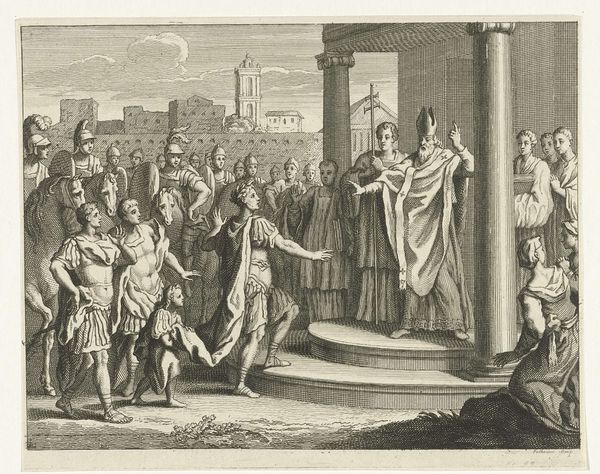 Curator: It has this almost storybook quality, wouldn't you say? Like a scene plucked from a rather serious fairy tale. Editor: This engraving, "H. Sebaldus van Neurenberg als kluizenaar," or "H. Sebaldus of Nuremberg as a hermit" by Jan van Londerseel, likely created sometime between 1580 and 1625, certainly does present a constructed narrative. What catches your eye specifically about its fairytale mood? Curator: It’s the almost theatrical arrangement of the figures within that wood. This group looks like a troupe of actors pausing mid-scene; Saint Sebaldus sermonizing while his former life observers the new. The setting feels both intimate and a bit performative. Like an epiphany, viewed by many. Editor: The visual construction reinforces societal norms and power dynamics. Consider the contrasting attire, for example. Saint Sebaldus is cloaked in relatively humble garb while those arranged around him wear clothing indicative of a wealthy ruling class. This could certainly play into contemporary understandings of class structure and, potentially, to underscore his choice of "giving up" those very structures to choose a more isolated and ostensibly moral life. The artist underscores Sebaldus' break with worldly status in embracing religious devotion. Curator: Absolutely. And yet, doesn’t he look almost…content? As though the weight of worldly matters is literally dropping off his shoulders? It suggests a sense of…joyous rebellion against constraint. Or, perhaps, as someone who spends a fair amount of time alone I may be merely projecting! Editor: And it could be seen from the alternative angle as being somewhat anti-social, pushing aside important members of society to venture down an alternative path alone, perhaps that also reveals other aspects of Jan van Londerseel's life at the time. Either way it makes for compelling considerations. Curator: A narrative, perfectly etched in time. That's fascinating! Editor: Yes, it leaves me with quite a lot to consider in how artists used history-painting and religious iconography. Thank you.