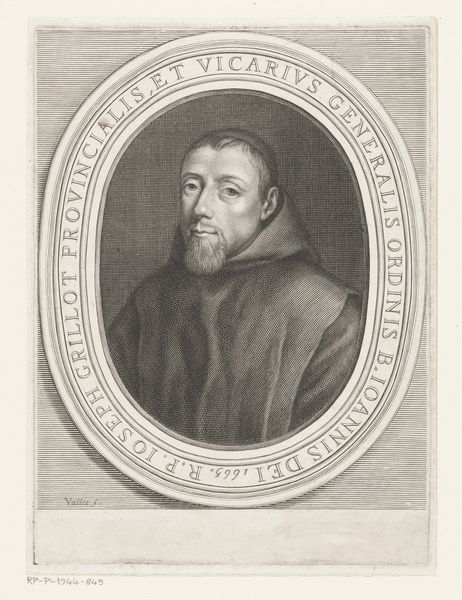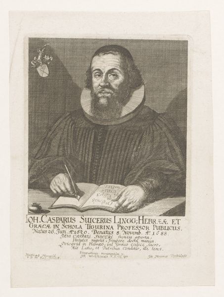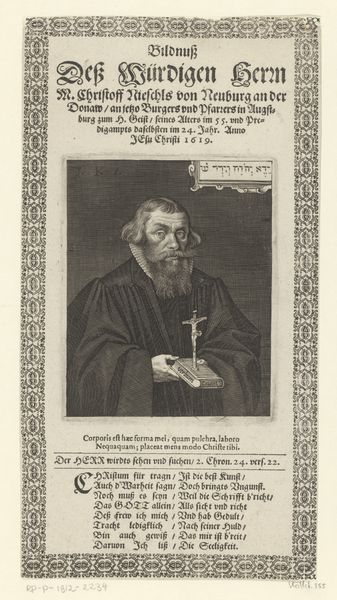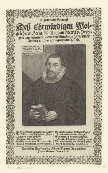Lucas Kilian created this portrait of Christoph Ehinger in 1617 using etching and engraving. Immediately, the symmetry strikes us. The composition is divided into clear sections, demarcated by ornate borders that frame the portrait and text. The monochrome palette enhances the solemnity of the subject, emphasizing texture and detail. The portrait itself depicts Ehinger, a clergyman, holding a book, likely a religious text. Kilian uses line and shadow to create depth, focusing on the face to convey Ehinger’s character. The precise lines and the structured layout reflect the order and discipline associated with religious authority. The text above and below the portrait functions as a commentary, framing Ehinger within a context of piety and scholarly dedication. Ultimately, this print operates within a semiotic system where every element – the portrait, text, and decorative borders – contributes to constructing meaning. The artwork doesn't just represent an individual, but communicates broader ideas about religious identity, authority, and the power of the written word.