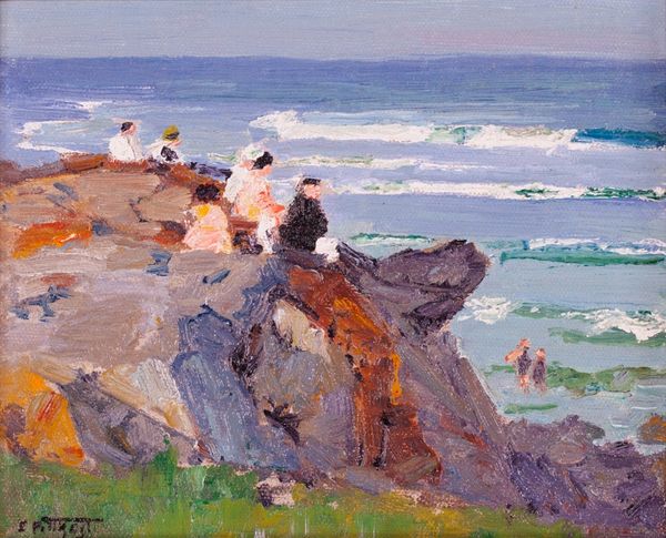 Curator: The piece before us is entitled "Rockbound Coast, Ogunquit," painted with oils in the plein-air tradition by Edward Henry Potthast. Editor: The sheer weight of those rocks—they’re rendered with such solidity. You can almost feel the sun baking the surfaces and sense the ruggedness underfoot. Curator: Note how Potthast divides the canvas. The jagged, sun-drenched rocks occupy the lower two-thirds, contrasting with the serene, blue expanse of sea and sky above. That dichotomy generates a pleasing tension. Editor: And those broad, visible brushstrokes. Look how the artist has manipulated the impasto to create the textural reality. This speaks to the intense labor required to capture this vista. Consider, too, the materiality of the pigment itself, ground and mixed, contributing to this specific, almost tangible scene. Curator: Precisely! Potthast is playing with depth through colour and light. The rocks in the foreground are rendered in warmer hues, their details sharp, drawing our eye in. Then, the distant ocean fades into cooler blues, creating atmospheric perspective. The eye is drawn back along those orthogonals! Editor: There's a deeper context too. Ogunquit was, and is, a resort and artist's colony in Maine. These rocks have literally been mined by tourist gazes for over a century. Potthast offers his labour for sale here in an object that replicates a "natural" environment already constructed via tourism and aesthetics. Curator: The scale is significant, too. It feels intimate. Not grandiose. Suggesting this work's connection with Impressionism. A visual fragment, captured. Momentary effects over permanence, a slice of sensory experience. Editor: But this moment becomes commodity too, packaged up to feed and recreate ideas of tourism and escape in those who consume it. A potent intersection of work, aesthetic encounter and ownership is occurring here. Curator: The tension between the fixed, weighty land, and the boundless, flowing sea really encapsulates something. The still vs. the ever changing! Editor: That's well observed. It helps bring all these considerations together. There’s something powerful about understanding an artwork in this deeper context of material processes.