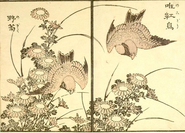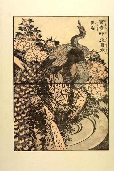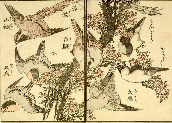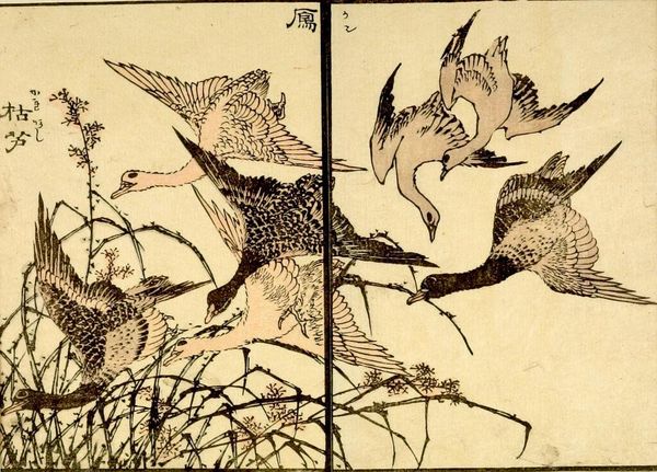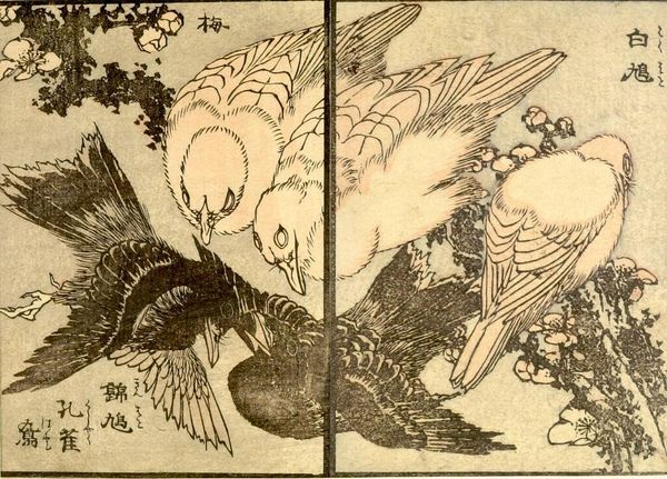 Curator: Well, isn't this just lovely! A peaceful, almost meditative scene unfolds before us. Editor: Here we have a page from "Kacho Gaden," an illustrated book by Katsushika Taito II. It features two cranes amidst pine branches, a pairing rich with symbolism in Japanese art. Curator: Symbolism aside, the way the artist captured the subtle curve of their necks and the textured plumage is just so beautiful. It is such a calming image. Editor: Cranes often represent longevity and good fortune, while pine trees symbolize steadfastness. Together, they speak to enduring prosperity, which was important to the rising merchant class in Japan. Curator: True, but I see beyond just symbols. There's a real grace here. The composition has a balance that feels almost spiritual, don't you think? I find myself quite still contemplating it. Editor: Yes, it certainly elevates the everyday. These images reinforced the status quo, idealizing nature and traditional values in a time of social change. Curator: So much more than a pretty picture, then. It's a whole world. Editor: A world carefully crafted and positioned within a specific historical context!