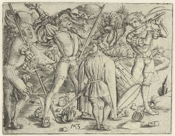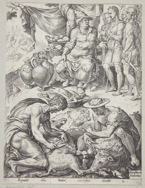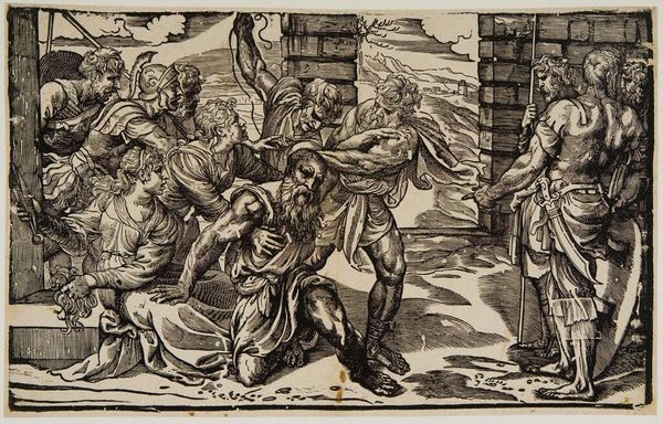 Editor: So, here we have Theodoor van Thulden’s "Odysseus in het land van de lotuseters" from around 1632. It looks like an ink drawing or etching. I find the figures very compelling. They all appear to be in distress, with such incredibly modeled physiques. What do you see in this piece? Curator: The immediately striking element is the masterful use of line. Look how Thulden employs varied densities of hatching to articulate form and create depth. Note the strong, almost diagrammatic outlines. Also the intricate composition guides the viewer's eye in a continuous loop from the beckoning figures on the left to the entranced ones on the right. Editor: The shading really does bring them to life! What is it about the composition that is significant? Curator: The figures’ arrangement into groups, delineated by strong lines and shadows, emphasizes the psychological separation between those still under the spell and those being urged to leave. Observe also, how the stylistic details serve to emphasize the contrast in emotional states. Is that difference effectively conveyed or is there a flaw? Editor: I think the contrast works really well. Seeing the men pulled in opposite directions like that really gets across the allure and the danger of the lotus. I can definitely appreciate how the composition underlines that. Curator: Indeed, and reflecting upon the structural relationships within the artwork, and how they generate its meaning, gives us, perhaps, the best method for analysis of Thulden’s choices. Editor: Thanks, I never really thought of analyzing the composition so rigorously! It gives a totally new appreciation to how the artwork generates narrative.