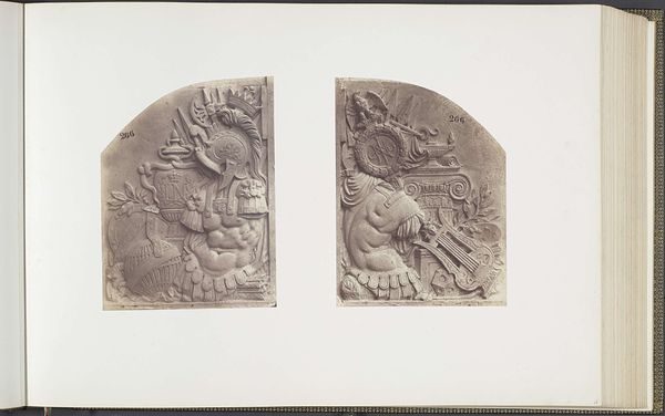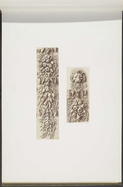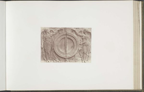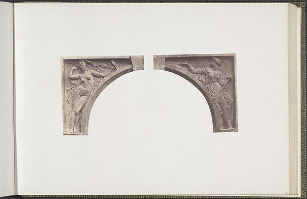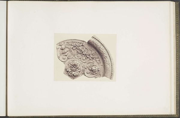 Curator: Here we have an albumen print by Édouard Baldus, a photographic study from around 1855 to 1857, titled "Gipsmodel voor een gewelfversiering van het Palais du Louvre door François Théophile Murgey" — essentially, a photograph of a plaster model for a ceiling decoration in the Louvre. Editor: Immediately, the creamy tones and the shallow depth of field give it a beautifully ethereal quality. It's almost like gazing upon a ghostly echo of classical art. Curator: Indeed. Baldus masterfully uses light and shadow to accentuate the delicate relief of the plasterwork. Note the precise articulation of the putto and the intricate floral patterns – hallmark features of the Neoclassical style it exemplifies. The circular or fan shape creates dynamic movement of the angel towards the urn. Editor: The Neoclassical embrace of idealized beauty always raises questions for me. Considering the sociopolitical climate of mid-19th century France—marked by stark class divisions and emerging social unrest—how might this idealized representation of cherubic innocence and opulent ornamentation function ideologically? This feels very much like a tool for obscuring real living conditions, in order to enforce conservative structures and ideas about beauty. Curator: I see your point, but from a purely formal perspective, observe the balanced composition and the rhythmic repetition of forms. The elegant arabesques draw the eye across the surface, culminating in the central figure of the winged child presenting an urn. The entire ensemble suggests a harmonious and ordered vision of beauty and virtue. The interplay of curves and angles in this particular configuration lends it a sense of classical grace. Editor: That "sense of grace" for whom, though? I can’t help but think about the absence of working-class hands that constructed the opulent decorations of the Louvre—the labor rendered invisible by Baldus's selective vision. Neoclassicism as a political statement is more clearly seen here as propaganda—glorifying the opulence while suppressing the means by which it came to be. Curator: Perhaps. Still, we can admire the technical skill of both Murgey in sculpting the original plaster model and Baldus in capturing it so exquisitely. It really is a marvel in photographic artistry and architectural representation. Editor: I agree. Baldus certainly demonstrates mastery, although my thoughts turn to the broader political and cultural currents. Curator: A perfect intersection, then, where form and context can enrich each other.