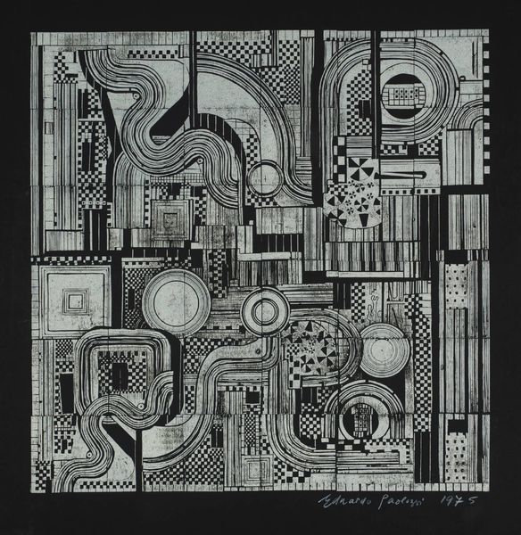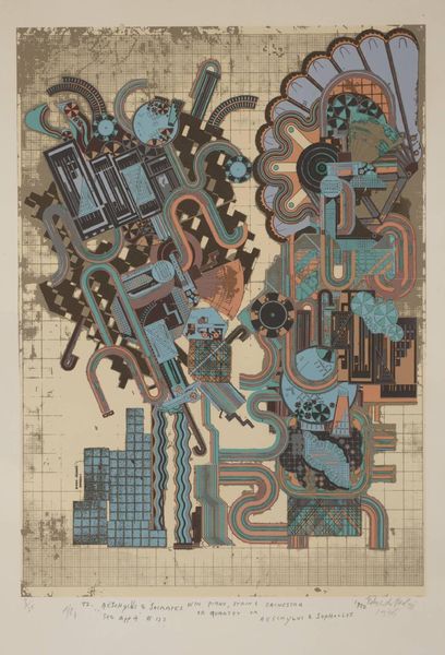 Curator: Eduardo Paolozzi's "From Early Italian Poets," part of the Tate collection, presents a fascinating visual puzzle. My immediate impression is one of intricate machinery, a system of pipes and conduits rendered in cool blues and grays. Editor: Yes, and within that machinery, I see nods to early Futurist manifestos; the celebration of the industrial age is tempered by a creeping sense of alienation. Is it progress, or a prison of our own making? Curator: Paolozzi often explored the impact of technology on society, pulling from advertising and mass media. Here, the title draws a fascinating parallel: do we read these poets differently through a mechanical lens? Editor: It's a powerful juxtaposition. By embedding literary tradition within an industrial aesthetic, Paolozzi critiques the dehumanizing potential of unchecked technological advancement. Curator: Absolutely. The cool palette further emphasizes this sense of detachment. But perhaps there's also a commentary on how we process information. Editor: Indeed. It is a potent reminder that even the most seemingly objective forms, like machines, are imbued with cultural meaning and social commentary. I keep seeing how the artist subtly weaves together past and present, inviting us to reconsider progress itself.