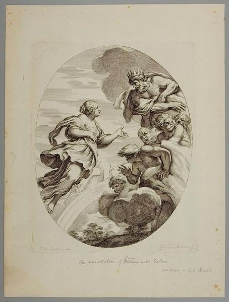 Curator: So, here we have Ferdinand Ruscheweyh’s “Faust on the Blocksberg,” currently residing at the Harvard Art Museums. Editor: It feels ethereal and unsettling; the figures seem to emerge from the paper itself. Curator: Indeed, the sepia wash contributes to that ghostly effect. Ruscheweyh captured a scene from Goethe's Faust, a night of revelry and magic on the Blocksberg mountain. Note the balance between the figures and the radiating light. Editor: Yes, and the layering of light and shadow. What do you think is the purpose of this ethereal light? Is it meant to convey spiritual ascension or the madness of that night? Curator: Perhaps both. It is a study in contrasts; the solid forms of Faust and Mephistopheles juxtaposed against the swirling, spectral figures above. Editor: This interplay truly captures the struggle between the material and spiritual realms that's central to Faust. It's a reminder that even in darkness, there’s a strange sort of illumination.