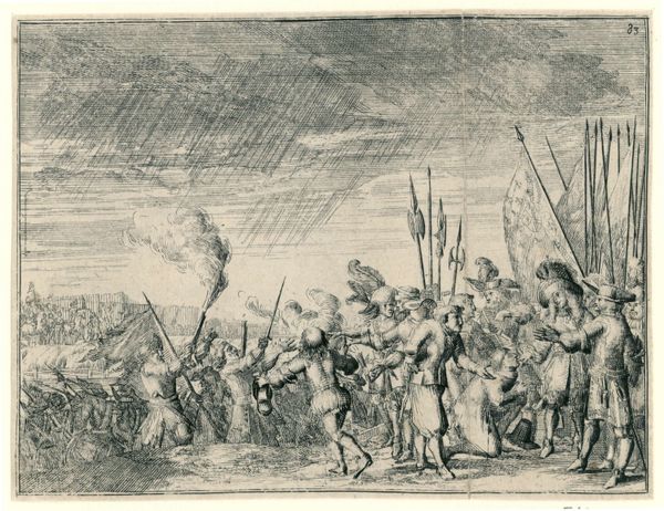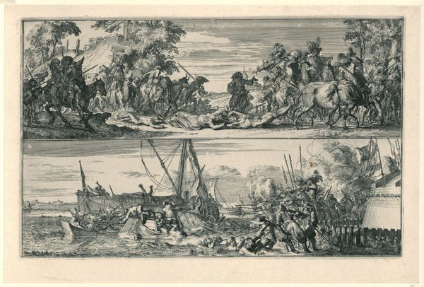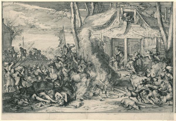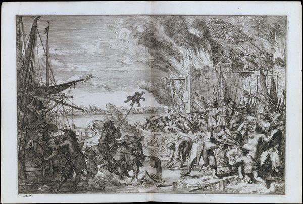 Romeyn de Hooghe made this print of atrocities in a waterfront village in 1672 using etching and engraving techniques. The stark contrast of black lines on white paper delivers a powerful visual punch, emphasizing the chaos and violence depicted. The method of production here is critical. Etching involves coating a metal plate with wax, scratching an image into the wax, and then immersing the plate in acid. The acid bites away at the exposed metal, creating grooves that hold ink. Engraving, on the other hand, uses a tool to directly cut lines into the metal. The combination allowed de Hooghe to create intricate details and a wide range of tones, from the deepest shadows to the brightest highlights. Prints like this one had a crucial function: the relatively inexpensive process allowed images to be widely distributed and consumed, shaping public opinion and constructing collective memory. The graphic horror shown here surely fueled anti-French sentiment. This print is a prime example of how craft and design can be intertwined with politics and social commentary.