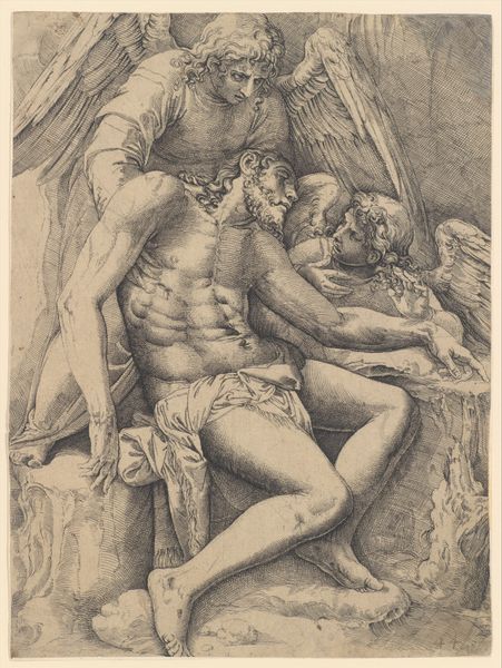 This print, "Profeet Jona," by an anonymous artist, employs engraving and etching to depict a biblical scene. These techniques involve using sharp tools to incise lines into a metal plate, which is then inked and pressed onto paper. The material quality of the print emphasizes line and texture, which in turn, define form. The engraved lines create a sense of depth and shadow, lending drama to the figure of Jonah and his celestial companions. Printmaking, in its essence, is a reproducible medium, democratizing art. Unlike unique paintings or sculptures, prints can be produced in multiples, making art accessible to a broader audience, regardless of class or status. Moreover, the skilled labor required for engraving and etching speaks to the socio-economic context of artistic production. It reflects the specialized skills and craftsmanship inherent in creating these images. Recognizing the labor and materials involved allows us to appreciate the cultural significance of this artwork, bridging the perceived gap between fine art and craft.