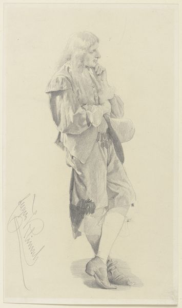 Marcus Tuscher made this drawing of a standing helmeted warrior with a lance in his right hand in approximately 1705. Dominated by soft greys and browns, the figure emerges from the paper's surface through delicate lines and subtle shading. The artist's focus on texture, particularly in the warrior's clothing and feathered helmet, evokes a tactile quality that invites close inspection. Tuscher’s exploration of form and materiality invites us to consider how these formal elements reflect broader artistic and philosophical concerns. The warrior’s stance, with a hand resting confidently on his hip, projects an air of self-assurance and command. Yet, the soft lines and muted tones also suggest a degree of vulnerability, hinting at the human condition beneath the armor. The composition itself, with its vertical emphasis on the lance and the figure’s erect posture, reinforces the idea of strength and resolve. In the end, it prompts ongoing interpretations and re-interpretations within the contexts of power, representation, and the self.
