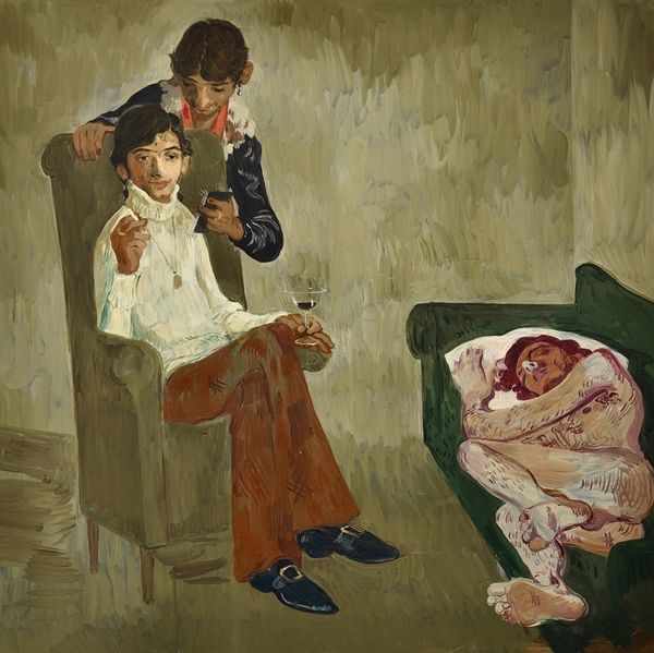 Salman Toor made this painting, *Time After Time*, with oil on panel, and I love the way the paint kinda sits on the surface. It's not trying to hide itself. Look at how the colors glow—that saturated orange of the figure on the left just vibrates against the cool green of the armchair. It's like a clash, but a good clash, you know? And the way Toor handles the brushstrokes, they're loose, almost casual, but they build up to create these really tender, intimate moments. I'm thinking especially of the brushstrokes on the left figure's back, how they curve and define the space, they give the feeling that the figure is leaning in to whisper something. It reminds me a bit of early Fairfield Porter, that same sense of everyday life elevated through color and light. But Toor brings his own contemporary perspective, his own unique voice to the conversation. Ultimately, it's up to us to decide what this all means.