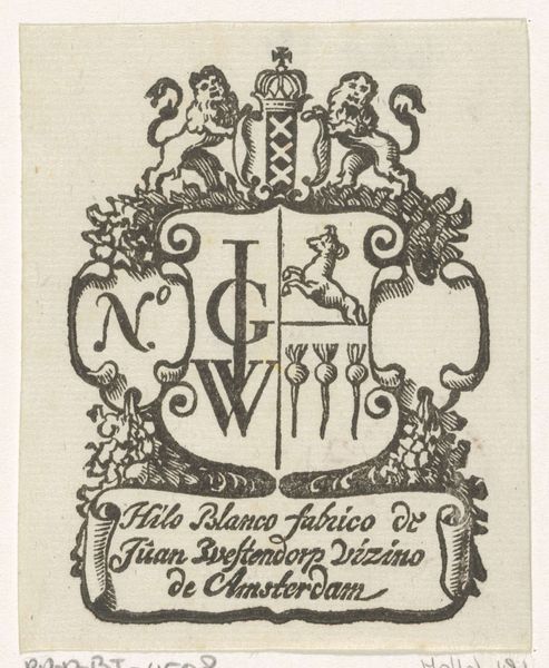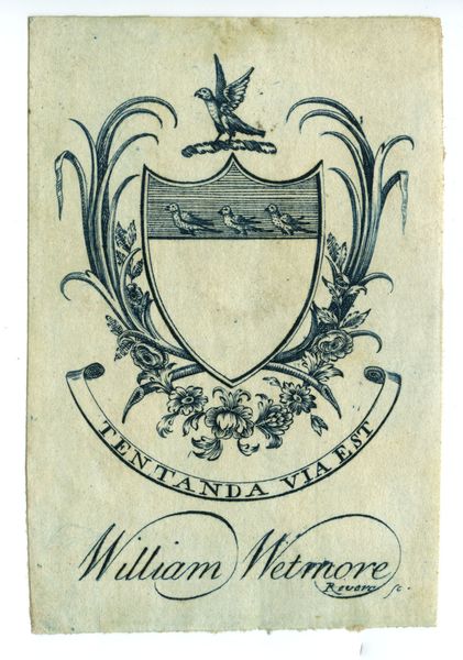 Curator: Take a look at this exquisite bookplate. Created around 1784 by Paul Revere, it's an engraving in ink, made for Perez Morton. The bookplate presents a coat of arms. Editor: The craftsmanship is superb, considering the scale! It’s delicate but powerful, with that rampant lion. How does it function in a society wrestling with identity? Curator: Excellent question. Heraldry, even in revolutionary America, served as a potent symbol of lineage, status, and belonging. This lion, combined with the motto "Deo Tum Patriae" – "For God and Country" – would resonate deeply. Morton clearly aligns himself with tradition. Editor: What's fascinating is that Revere was so crucial in designing money and weapons for the US, and that here is another side to his labor: he takes up this more artisanal production for someone of note. How would the materiality of print have affected Morton's own conception of himself? Curator: Indeed, this very personalized heraldry is carefully composed in lines, forms, and allegorical suggestion. Look closely: even the hand clutching at the very top, extending itself downwards, gestures both to divine provenance, perhaps, and simultaneously clutches property. Revere has thought of the details of making this visual emblem emotionally powerful. Editor: I’m struck by the contradiction, a revolution built on the back of the kinds of fine details which required specialized, lengthy labor. Curator: Yes. In owning a book marked in such a personalized manner, Morton’s legacy itself became enmeshed in both its visual expression and in a material culture of the book. We’re seeing a moment of negotiation in selfhood between visual memory and revolutionary promise. Editor: It is tempting to believe it all broke suddenly with the Revolution. Curator: That would not do justice to those subtle accommodations within it. Look closer. What you find reveals those paradoxes in ways not written in history. Editor: Beautiful. Thanks for helping me linger with that thought.