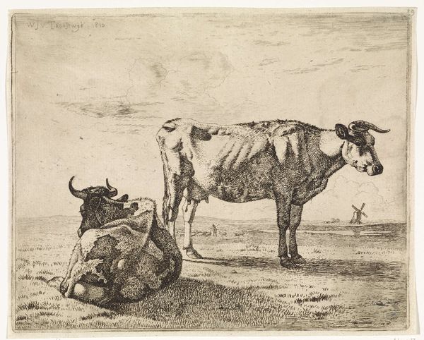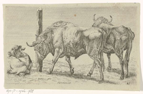 This etching presents two oxen, one rubbing its head against a post, captured by an anonymous hand. The ox, a symbol of strength and labor, is here depicted in a moment of peculiar repose. The gesture of rubbing against the post—is it mere relief from an itch, or something more profound? Consider the ancient bull cults, from Minoan Crete to the Near East, where the bull embodied virility, power, and sacrifice. The simple act of scratching becomes an echo of ritual, a primal connection to the animal's instinct. How has this imagery been passed down through history, shifting in meaning? Perhaps it's a projection of our own subconscious desires for release, for a return to a more grounded state. This humble etching quietly engages viewers, resonating with the complex interplay of culture, memory, and the enduring power of primal imagery.