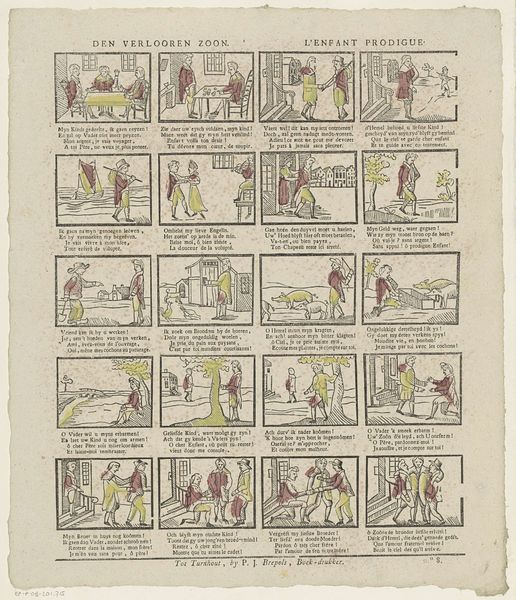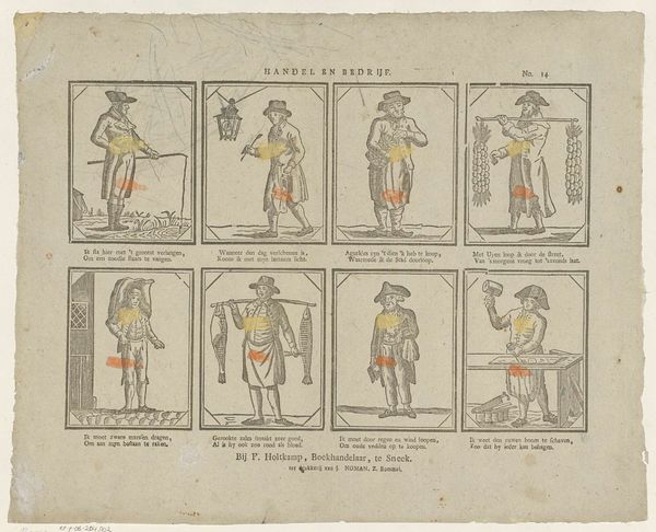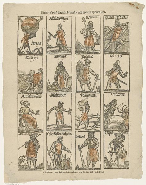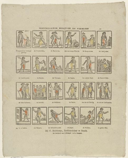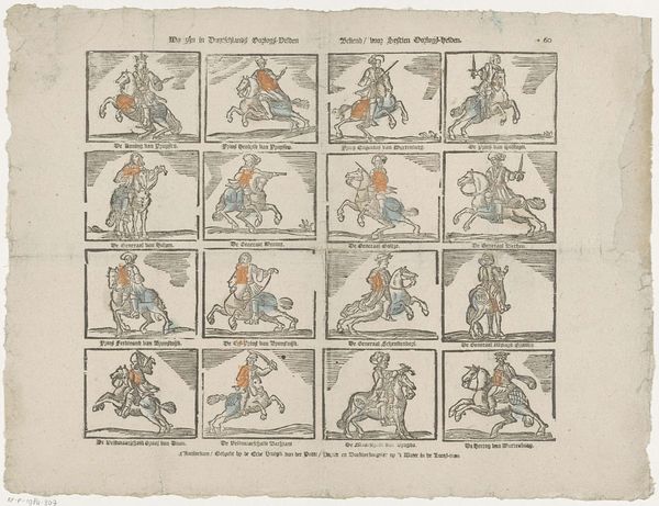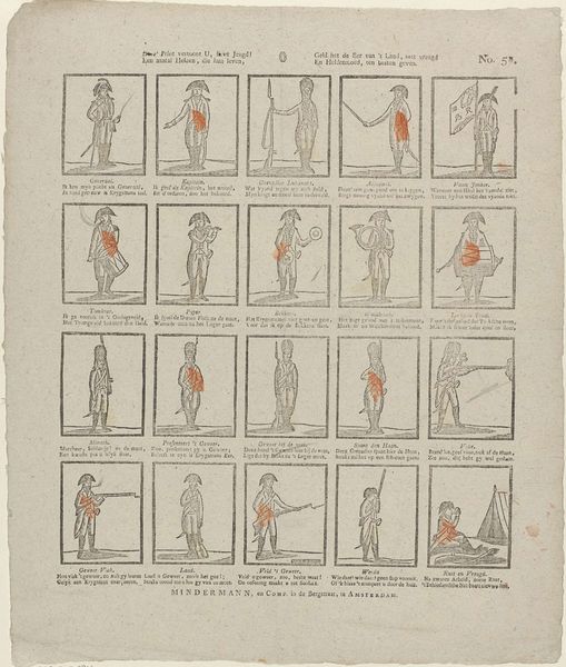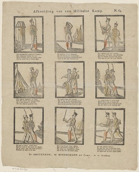 Curator: Oh, what a curious little thing! It feels like stepping back into a toy soldier’s dream. Editor: Indeed! Here we have an engraving titled "De dappre krijger, onder vaderlandsche vanen…", dating roughly from 1822 to 1849. The print, attributed to Mindermann & Co. of Amsterdam, resides now at the Rijksmuseum. Notice the grid of twelve miniature scenes. Curator: They are like snapshots of tiny dramas. Each little frame captures a different kind of soldier, a little world of bravado and bright uniforms. What's striking is how neatly compartmentalized it all is. The scenes, figures, and their stories, are so small yet full of purpose. It makes one reflect on how we create order. Editor: Order is paramount in engravings, of course! Note the clean, precise lines that define each figure. The use of hatching and cross-hatching creates subtle tonal variations, defining form within a restricted palette. The geometric divisions establish a narrative sequence ripe for deconstruction. Each panel is a semiotic unit in service to the overarching theme of patriotic militarism. Curator: Semi-what now? For me, it speaks to that deep human longing for a grand narrative, for a part to play in something bigger. You've got your brave warrior ready to claim his glory! They’re so hopeful and a bit innocent, caught in the machinery of something they maybe don't even quite understand. But aren’t we all a little bit like that, darling? Editor: That touches on the complex relationship between art and its ideological context, doesn't it? Curator: In miniature. And to what end, if peace is what every soldier truly desires? Even though that geometric frame holds them securely, you still feel their pulse for something greater. It’s a sweet kind of melancholy. Editor: You’ve made me consider beyond the grid’s neat precision to discover an unexpected narrative complexity here. I came in appreciating just the meticulous lines but I depart thinking about more ambiguous interpretations of patriotism and valor.