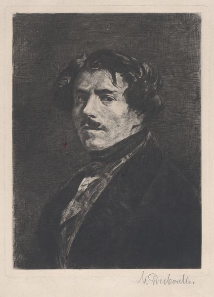 Editor: This drawing, "James McNeill Whistler," created between 1875 and 1885 by Paul Adolphe Rajon, is really striking! The texture created by the pencil work gives it so much character. What are your thoughts when you look at this piece? Curator: What captures my immediate attention is the dynamic interplay between line and value. Notice the artist’s economical use of line, achieving a remarkable likeness through the modulation of pressure and density. Editor: That’s true. It's interesting how little detail there is, yet it clearly conveys the person's features. Is there anything more to say about it's lines? Curator: Consider, also, the composition itself. Rajon's placement of the figure within the picture plane and how the tonal variations across the surface invite the eye to traverse and linger. The materiality of the graphite on paper is also important to acknowledge: the very stuff of the artwork contributes to its presence. It has its unique syntax. Editor: I hadn't really noticed those aspects initially. It’s clever how the artist uses just a few lines to define shapes. Now I understand how the texture and tonal range define the work! Curator: Exactly. Form precedes content, wouldn't you agree? That close attention to shape and texture can reveal so much without needing external references. Editor: Thanks, this has opened my eyes. It's fascinating to think about how just line, form and texture make up a piece!