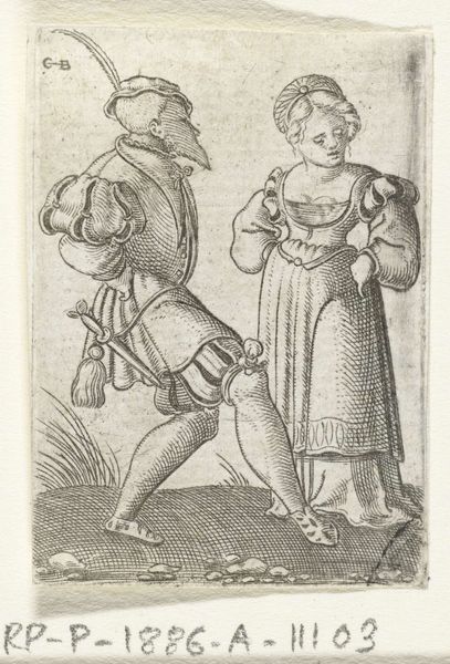Curator: Look at the rhythmic quality captured in this 1537 engraving. Sebald Beham's "Dancing Peasants," housed here at the Rijksmuseum, invites us to imagine the sounds and energy of a village celebration. Editor: My immediate impression is one of tension. The cross-hatching creates a sort of visual dissonance, at odds with the supposed gaiety of the subject matter. There's a harshness to the line work. Curator: Indeed, Beham, known for his participation in the German Peasants' War, often imbued his genre scenes with underlying social commentary. This dance might not just be for revelry; it also symbolizes a break from traditional values, a kind of defiant performance against authority. Note the figures’ lively, perhaps exaggerated movements. They almost break free of their static print existence. Editor: You’re right. There's definitely a raw energy in the male figure's posture—a wide stance and high leg kick suggest almost reckless abandon. He occupies more space, doesn't he? Dominates the composition, though technically they're both central. Curator: Absolutely. The woman, holding her skirts, is caught in the dance but perhaps more demure. This image would circulate widely, speaking volumes about peasant culture in a world still deeply steeped in the feudal past. Remember too the Reformation was still fresh; dancing itself was viewed with suspicion in some quarters. Editor: Fascinating to consider the performative nature of their attire too. While rendered simply, their garments and embellishments contribute to a visual layering and texturing. These details, in concert with the rigorous lines and contrast between light and shadow, create this palpable sense of movement and noise. Curator: A noise indeed. It is a powerful reminder that even simple genre scenes from centuries past vibrate with complex meanings. What seems on the surface as an informal dance speaks of larger forces: the push and pull of class, the uncertainties of religion, and the eternal desire for communal joy. Editor: Precisely. Focusing on the structure—the choreography of lines and the distribution of light—enhances our insight into the thematic complexities embedded in this image. This engraving becomes more than a rendering of dance, evolving into an analysis of human behavior.
