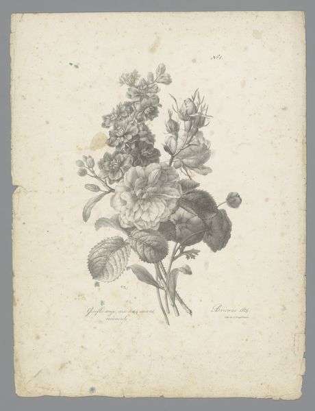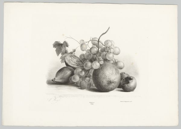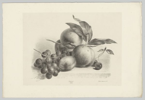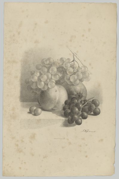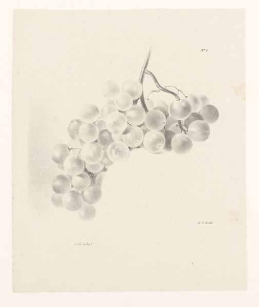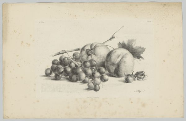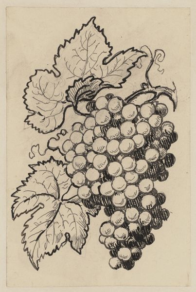 Curator: Welcome. We’re standing before “Druiventros,” a drawing made with pencil and colored pencil on paper, sometime between 1820 and 1833. The artist, Anton Weiss, is less well-known today, but this botanical study is a fine example of his skill. It's currently held here at the Rijksmuseum. Editor: First impression? It feels…weighted. Those grapes are heavy, dense, and rendered with such somber precision. It’s beautiful, but melancholic, somehow. Almost like a memento mori, but in fruit form. Curator: Indeed, the grapes do hang quite heavily, don’t they? In Christian iconography, grapes, like wine, are symbolic of the blood of Christ. It’s often a signifier of sacrifice, and, of course, communion and spiritual nourishment. Here, though, I see more of a straightforward botanical study. A careful examination of nature. Editor: Oh, absolutely. I don't want to impose meaning where it isn't intended, but isn’t it fascinating how readily those symbols surface? Even in what seems to be objective observation. That subdued color palette—greys, muted greens, touches of faded violet—it strengthens that feeling, you know? It doesn’t pop like a sunny still life; it breathes quiet reflection. Curator: Weiss's meticulous attention to detail also conveys meaning, especially around ephemerality. Consider how carefully he’s rendered the leaves, showing subtle decay near the edges, indicating time passing, the life cycle continuing. He captures nature, but suggests also it's fading, fragile quality. Editor: Like capturing a memory fading…beautifully preserved in graphite and faint color. This single cluster of grapes carries so much… It really highlights the power of observation, and how even something simple can resonate on multiple levels. You've given me a whole new way of thinking about simple art, the cultural context. Curator: And your insight reminds me how powerful these symbols become with subjective impression! We imbue our lives and memories into every sign. The personal and historical blend! Editor: Well, let's go find our next reminder. What wonders will we unpack now?