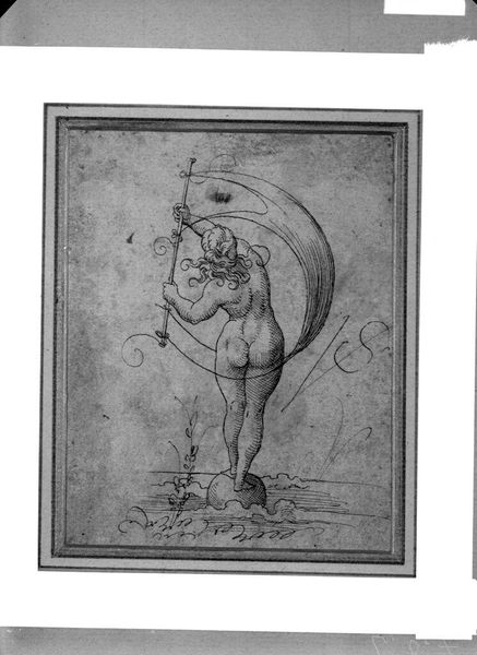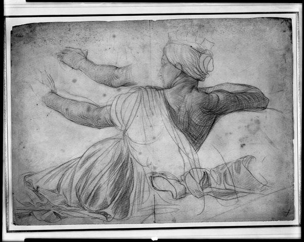 Editor: This is Ernest Meissonier’s "Man in 17th-Century Costume," a drawing at the Harvard Art Museums. He looks like he’s dancing, maybe in the middle of a sword fight? What do you see in this piece? Curator: Oh, I love this! It's like a snapshot of swagger. Meissonier, obsessed with historical detail, captures not just the clothes, but the attitude. Notice how the light catches the silk breeches—almost a cheeky glint. It makes you wonder what story he’s acting out, doesn’t it? Editor: It does! It feels like a fleeting moment, perfectly captured. Curator: Exactly! Art that whispers possibilities is always the most enchanting, wouldn’t you agree?