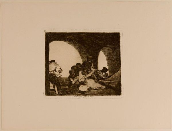 Curator: This is “One Cannot Watch This” by Francisco José de Goya y Lucientes, currently held at the Harvard Art Museums. It’s a small print, roughly 14.5 by 20 cm. What's your immediate reaction? Editor: Gut-wrenching. The title is spot on. It’s that moment right before… the unspeakable, bodies huddled together for some semblance of protection, yet utterly vulnerable. Curator: Goya often uses darkness to symbolize ignorance or oppression. Notice how the light only illuminates the executioners, obscuring the faces of the victims. Editor: Right, the faceless firing squad. It's a universal image of terror, isn't it? The blind acceptance of authority leading to unimaginable cruelty. Curator: Precisely. He captures the breakdown of social order and empathy, a theme prevalent in the “Disasters of War” series. It reflects a deep psychological and cultural wound. Editor: Even now, centuries later, it rattles the soul. I keep wanting to look away, but can’t. Perhaps that's the point, isn't it? To confront the darkness.