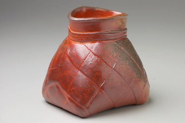 Editor: Here we have the "Jug still bank," a ceramic folk art piece made around 1880. It's quaint, and I'm drawn to how… sturdy it looks. Like it was built to last! The color is lovely as well. I would describe it as a muted rustic brick red, which works very well with the piece being what looks like a home-made vessel. What story do you think it tells? Curator: Well, doesn’t it just shout out "homemade practicality meets a playful urge to save"? I picture a family carefully crafting this stoneware jug, then firing it up with such a bold color, right in their backyard kiln, maybe while a hound dog naps nearby. Then they had a genius moment—cutting a coin slot! It's simple but profound, linking resourcefulness with the slow build of security. Did this bank hold dreams or just pennies, I wonder? It certainly feels warm and inviting. Like coming home. Don’t you agree? Editor: Definitely. I didn’t think of the backyard kiln… the kind of grit that this artwork embodies. This is miles away from an industrial-style product of that same era, say, from the Wedgwood factory. It's more personal and feels more deeply connected with the makers. Curator: Exactly! It bypasses cold perfection. It’s flawed, beautifully imperfect. It’s full of a tactile soulfulness. Did you also notice that rustic charm it exudes, blending into a seamless and utilitarian stoneware shape? This also evokes themes of self-sufficiency and folksy ingenuity from the time, making it such an amazing little bank with an incredible personality. Editor: It's remarkable how a seemingly simple object like this bank can hold so much historical and emotional resonance. I would like to learn more! Thank you! Curator: Indeed! It’s always a thrill peeling back layers to reveal a heart brimming with human stories and echoes. These humble relics help us hear what still needs hearing.
