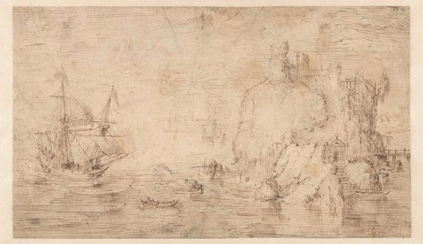 Editor: We’re looking at Salvator Rosa’s "Marine landscape with figures," likely from the mid-17th century. It's an ink drawing, and the sepia tones give it such a warm, aged feel. What symbols or motifs strike you in this landscape, with all the people gathered near the boats? Curator: It's fascinating how Rosa uses the marine landscape itself as a symbol, isn't it? The sea, traditionally, represents the subconscious, the unknown. Coupled with the figures, it evokes a sense of journey, perhaps even peril. Do you see how the light catches the edges, giving definition to certain points of human activity but rendering everything else vague? Editor: Yes, the ambiguity is striking. The figures are grouped, but their purpose isn’t clear. Are they arriving or departing? What narratives might they carry? Curator: Exactly! And consider Rosa's baroque style – it’s known for drama and heightened emotion. So, if we view these figures as allegorical representations of humanity at a crossroads, what historical, psychological, or emotional states might this evoke, knowing the artist lived through periods of war and social unrest? Editor: That definitely changes how I see it. I initially just saw a simple waterside scene, but the 'journey' reading coupled with social unrest adds another dimension. Curator: Remember, Rosa often incorporated symbolism reflecting political themes or philosophical contemplation, inviting the viewer to interpret narratives that might otherwise remain obscured. Notice the placement of the vessel amidst turbulent landscape...does that resonate with you differently now? Editor: Absolutely! I appreciate how unpacking the symbols and historical context adds so much depth to the experience. It feels less like just viewing a scene and more like deciphering a story. Curator: And that deciphering allows us to access the enduring power of these images. Every element, from the figures’ postures to the light’s play, reflects a desire to engage viewers with the enduring stories we humans continue to re-enact.