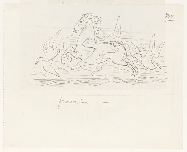 Editor: This is "Studieblad met paard en drie zeemeeuwen," or "Study Sheet with Horse and Three Seagulls" by Leo Gestel, likely made between 1891 and 1941. It’s a graphite drawing on paper, housed here at the Rijksmuseum. The light and airy lines give it a sense of dreamlike motion. What strikes you about its composition? Curator: The immediate impression is of dynamic tension created through the interaction of forms. The horse, rendered with a seeming spontaneity of line, is juxtaposed against the more static presence of the seagulls. The diagonal orientation further emphasizes this sense of movement, drawing the eye across the plane. Observe how the artist uses line weight; heavier contours define the horse's musculature, while delicate, almost ephemeral lines suggest the lightness of the birds. Editor: I see what you mean about the contrast. It’s almost like two separate studies combined into one. Is there a hierarchy in the drawing, in your opinion? Curator: The hierarchy is definitely constructed through form and placement. The horse, being the larger and more detailed figure, commands visual dominance. Note how the artist frames the composition with implied horizon at the bottom and subtle cloud-like masses. Gestel invites us to consider relationships between form and emptiness and their effects. Editor: That's interesting, focusing on the interplay itself, rather than narrative. So, rather than imagining what this scene might represent, you see it as Gestel exploring the effects of particular formal techniques. Curator: Precisely. The power resides not in illustrative storytelling, but in how the formal elements communicate independently. It underscores a fascinating interplay between intention and result within a focused investigation. Editor: I never considered that level of pure form! I’m beginning to understand how the shapes and their interaction become the story. Thanks for shedding light on it.