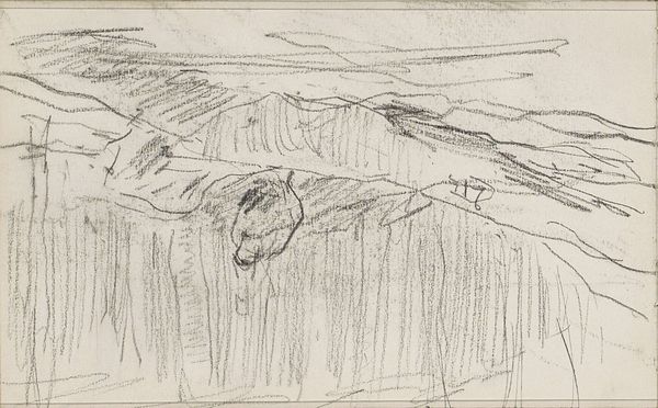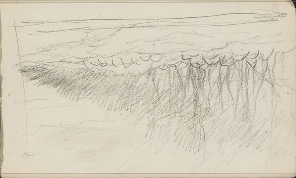 Anton Mauve created this drawing, "Bomengroep in een landschap," with a graphite pencil on paper. The composition presents a landscape dominated by a cluster of trees. Notice how Mauve employs a series of vertical lines to depict the trees, contrasting them with the more loosely defined, horizontal strokes that suggest the sky and landscape. The density of the lines creates a sense of depth. The subtle tonal variations achieved through the graphite lend a soft, almost dreamlike quality to the scene. The rough and unfinished quality destabilizes traditional landscape art. Mauve invites us to reconsider our relationship with nature and representation. Rather than offering a polished, idealized view, this drawing reflects on the intimate exchange between the artist and his subject.