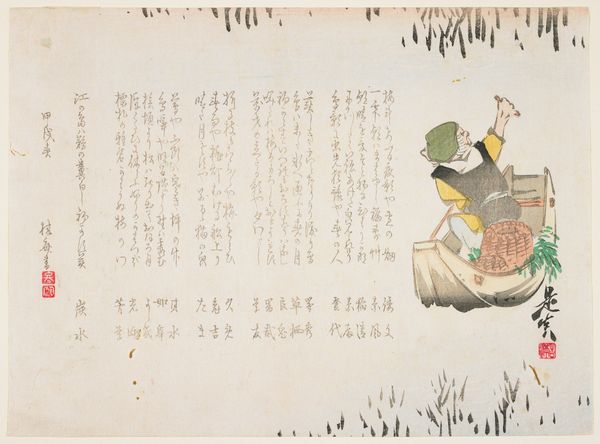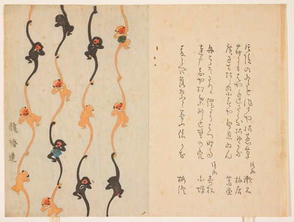 Tanaka Shutei created this woodblock print, "Parrot and Bells," in Japan sometime before 1858. The vibrant colors and playful composition draw the eye, but let's consider how Shutei destabilizes traditional meanings through form. Notice how the meticulous calligraphy contrasts with the vibrant parrot. Placed asymmetrically, the bird and bells are more than decorative; they disrupt the expected harmony. The bells, symbols of warding off evil, dangle precariously, questioning their protective power. The parrot, with its unnatural, rainbow plumage, sits rigidly, more a symbol of exotic artifice than natural beauty. Shutei uses a semiotic system where the parrot, bells, and calligraphy act as signs, challenging fixed interpretations of nature, protection, and artistry. The print invites us to question the established order, acknowledging the fluidity of meaning.