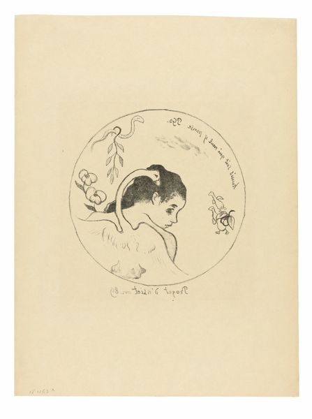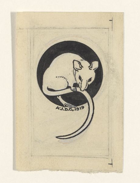 Editor: Here we have "Muis," or "Mouse," a 1919 print by Julie de Graag currently held at the Rijksmuseum. There's something so charming about its stark simplicity, just black ink on a cream background. I’m struck by the economy of line. What do you see in this piece from a formalist perspective? Curator: Indeed. Note the meticulous use of line to define the subject's form against the stark negative space of the circular background. Consider how this geometric constraint focuses our attention. The flowing lines create a visually striking interplay, delineating the figure with minimal yet effective detail. We see Art Nouveau's influence here. Editor: So, you're highlighting how the composition draws the eye, essentially isolating and framing the subject? The line work almost has a calligraphic feel. Curator: Precisely. De Graag employs line as both contour and texture. Look at the tail: the curve acts as a dynamic counterpoint to the static circle. Semiotically, what might that contrast signify? Is there a tension between the organic and the geometric, perhaps reflecting broader anxieties of the era? Editor: I hadn't considered that interpretation. I was focused on the image itself, its pure, distilled form, as you pointed out. The balance she achieves between detail and simplification is quite remarkable. I’ll have to think about the potential social meanings embedded in the forms. Curator: Visual analysis of line and form often reveals deeper structural insights. It forces us to confront how the artist chooses to depict reality. Editor: It’s amazing how much one can unpack by focusing on form alone. Thanks for showing me how to consider beyond just subject matter! Curator: My pleasure. Let's proceed to the next work and see what new insights await.