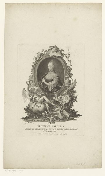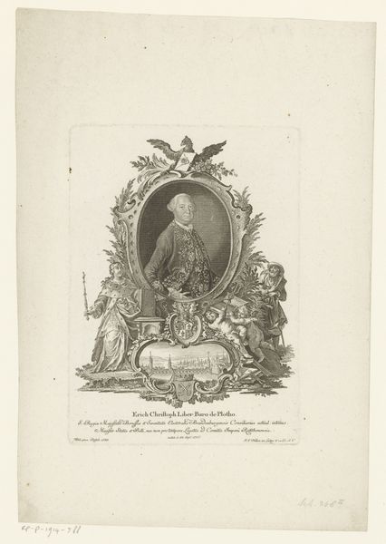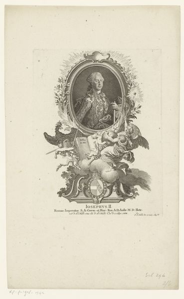 Editor: Here we have Johann Esaias Nilson's "Portret van Clemens XIII," an engraving created sometime between 1758 and 1788. It's teeming with Baroque ornamentation and looks remarkably like an official portrait. What do you make of the intricate composition? Curator: The visual orchestration is quite compelling, isn't it? Note how Nilson employs the oval frame. It focuses our attention on the subject, Clemens XIII, while simultaneously providing a contained space from which allegorical elements spill forth. Do you observe how the artist juxtaposes textures and forms to create a dynamic surface? Editor: I see the contrasting textures now. The smoothness of the portrait versus the dense foliage and symbolic objects is striking. Does this contrast contribute to the overall meaning? Curator: Intrinsically, yes. The formal arrangement directs our reading. The smoothness alludes to Clemens XIII's status, offering an idealized representation. Meanwhile, the textured surroundings signify his dominion and authority. This generates a visual dialogue about power and representation within the engraving itself. Observe the balance, the rhythmic repetition of shapes. Editor: So, by focusing on the elements within the work, like texture, shape and form, and how they are organised, we can unravel the meanings the artist constructs? Curator: Precisely! Formal analysis prioritizes the internal relationships. By scrutinizing Nilson’s structural choices, we gain insight into how meaning is produced within the artwork. Editor: That’s fascinating. I initially saw just a historical portrait, but I now appreciate how the very arrangement speaks volumes. Curator: Indeed, and it's through that lens that we recognize not just what is shown but how it’s communicated. The engraving is, thus, both image and intricate language.