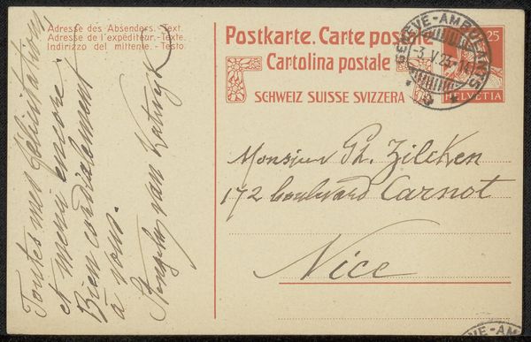 Editor: This is "Briefkaart aan Philip Zilcken," a mixed-media postcard, potentially from 1925, by Alphonse Stengelin. It’s giving me major vintage vibes with that Swiss stamp and faded landscape illustration, not to mention the beautiful cursive. What draws your eye when you look at it? Curator: Oh, the nostalgia is potent, isn't it? I’m instantly transported! I find myself pondering the intimacy of the handwritten message amidst the formal structure of the printed postcard. There's this dance between public communication – the generic "Carte Postale" – and private sentiment, addressed to "Monsieur Th. Zilcken, homme de lettres peintre et graveur" – a man of letters, a painter, and an engraver! Do you think Stengelin was acknowledging a kindred spirit? Editor: Possibly! The listing of Zilcken's professions feels quite intentional. I hadn’t really considered that contrast between the formality and the personal message. Curator: Exactly! Imagine holding this tangible piece of connection, sent across distance. Consider, too, the little landscape scene. A compressed idyll, almost yearning in its quaintness. I wonder what stories Zilcken's work might tell, informed by such exchanges. What do you suppose this tells us about the nature of artistic correspondence then versus now? Editor: That’s a great question. I think the tangible nature of a postcard adds a weight that an email simply doesn't possess. It speaks to a different pace of life and communication. Curator: Precisely! A memento of a specific moment, hinting at relationships, travels, and shared artistic passions, wouldn’t you say? Editor: Definitely! I'm now seeing this as more than just a postcard, it’s a mini time capsule. Curator: Agreed. It’s a whispering gallery of histories.