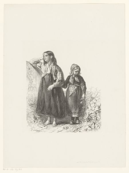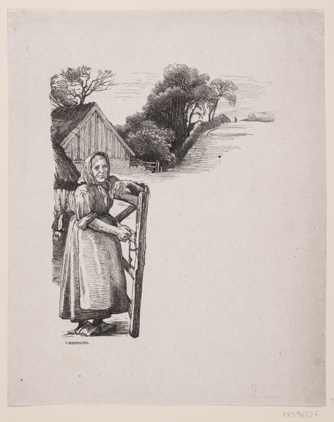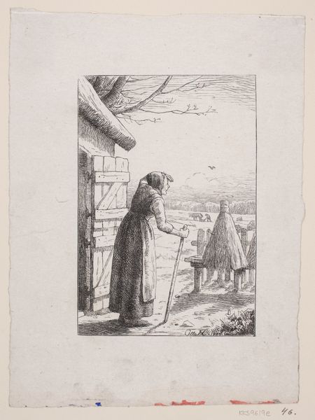 Editor: This etching, "Vrouw met een kind aan de hand" – "Woman with a Child by the Hand" - is attributed to Christiaan Wilhelmus Moorrees and believed to originate sometime between 1811 and 1867. I find it quite stark and simplistic. What do you see in this piece, considering its formal qualities? Curator: The piece is a fascinating exercise in line and texture. Notice the density of lines used to define the woman's figure and the bundle she carries, contrasting with the relative emptiness of the sky. This creates a clear figure-ground relationship, emphasizing the subjects. The etching technique itself, the varying depths and thicknesses of the lines, introduces a textural element, almost palpable in its rough, unpolished quality. Editor: So the focus isn't really on *what* they are doing, but *how* the artist uses the lines to build up the image? Curator: Precisely. The subject matter is secondary to the artist's manipulation of the medium. Consider how the hatching and cross-hatching articulate form, creating depth despite the limited tonal range. The diagonal lines in the sky, for example, suggest a subtle movement. And did you observe the signature at the bottom? Note its placement and how its angularity and orientation align with the posture of the woman in the print. How might we analyze that through structuralism? Editor: Interesting! I hadn't noticed how deliberate that signature was. Now, thinking about the textures and lines as being the focus definitely reframes how I see it. Thank you for the fresh perspective. Curator: The interplay of these elements ultimately draws us into its compositional unity. Viewing the etching from this perspective allows a deeper understanding of Moorrees' choices and the artistic vocabulary employed.