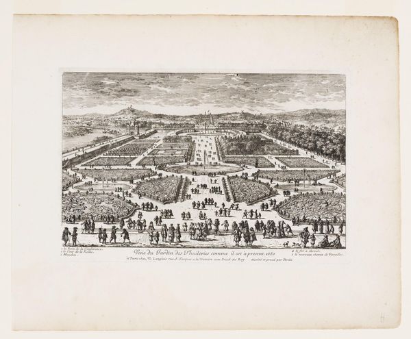 Editor: This print, "Gezichten op Paleis Het Loo, de bijbehorende gebouwen en het bijbehorende park," possibly made between 1690 and 1737 by Romeyn de Hooghe, presents a detailed panorama of the palace and its gardens. What strikes me is how meticulously planned everything appears. What do you see in this work? Curator: The organization of space is key. Think about what a royal garden symbolizes. It's about power, control, and the imposition of order onto the natural world. This image, functioning almost like a blueprint, served to project and reinforce that image. Consider how the surrounding smaller scenes amplify this, capturing life lived according to protocol. Editor: That’s fascinating, a blueprint for power! So the very act of depicting the gardens in this way, with such precision, becomes part of the message? Curator: Precisely. And what is history-painting without an exact image of the stage it played out upon? Reflect on the deliberate placement of figures within the garden – their choreography suggesting rituals, hierarchies, and a clear visual language that the intended audience would have instantly grasped. Even the smallest figure contributes to the broader iconography. Editor: It's incredible how much is communicated through the spatial arrangements and the symbolic value that projects outwardly, like ripples in water. Curator: Think of these meticulously placed statues: classical figures often used to convey specific virtues, or allegories that tie the present ruler to a lineage of great leaders. Even the specific flowers planted might have carried coded meanings lost to us now, but obvious to a 17th-century audience. What lasting effect might images like this have? Editor: I never would have considered that flowers or statues held coded meaning. So images of that time became lasting memories as well. Curator: The artist is creating not just a representation but a memory, solidifying a particular narrative for generations to come. It truly shows how an image extends through cultural memory.