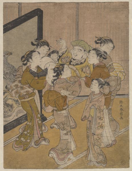This color woodblock print, "Woman Dancer in Daimyo's Palace," was created by Suzuki Harunobu. The composition unfolds with a striking arrangement of geometric forms and subtly contrasting colors. The scene is compartmentalized by the grid-like tatami mats, acting as a stage for the figures. Harunobu employs color and line to create an interplay between depth and flatness. Note how the ochre tones of the back wall complement the green and red floor, creating a sense of harmony. The figures are carefully placed, seemingly aware of their arrangement within the space. The dancer's white kimono, juxtaposed against the darker robes of the attendants, accentuates her movement and presence. We can interpret this artwork through the lens of semiotics. Here, each element operates as a sign, contributing to the representation of social status and cultural ritual. Harunobu destabilizes traditional perceptions of space, inviting us to consider the visual structure as a means of encoding complex cultural meanings. This print emphasizes the fluidity and ongoing interpretation inherent in art.