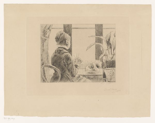 Editor: Here we have Ernst Ludwig Kirchner's 1934 etching, "Selbstbildnis im Atelier" or "Self-Portrait in the Studio," currently housed in the Städel Museum. It has a kind of haunted feel to it, with these very angular lines, and I’m curious how that relates to its history. How do you interpret this work? Curator: The haunted feel, as you say, is key. Consider the historical context: 1934. Kirchner was labeled a "degenerate artist" by the Nazis just a few years later. This etching, beyond a simple self-portrait, reflects a sense of unease and social isolation that permeated the lives of many artists during that time. Do you see how the cat at the window almost acts as an ominous observer? Editor: Yes, now that you mention it, the cat definitely adds to that sense of foreboding. The perspective feels claustrophobic, too. Was Kirchner deliberately commenting on the art world and the sociopolitical environment of the time through this piece? Curator: Precisely. The setting itself - the studio, traditionally a space of creativity and freedom - becomes a stage for confinement and anxiety. It's Kirchner using his art to confront and comment on the increasing pressures and threats against artists and artistic expression in Germany. How do you think this kind of personal-political statement impacted its reception, both then and now? Editor: I can imagine this etching stirred mixed feelings, potentially admired for its artistic boldness but also risky given the climate. Now, it seems like a poignant record of that era and its effects on creative individuals. Thank you. Curator: And thanks to you, by looking closer, we can perhaps see the personal as incredibly political, and a so-called simple portrait speaking volumes about an era of cultural crisis.