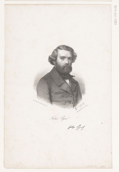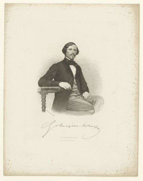 P.C. van Geel created this portrait of Carle Elshöecht as a lithograph around 1835. The print gives us a glimpse into the cultural and social values of the Biedermeier period, known for its focus on domestic life, and the rise of the middle class. The portrait captures Elshöecht with a certain level of detail that speaks to the importance of portraiture in solidifying social status and personal identity during this era. Notice the formal attire and controlled pose which reflect the subject's standing. At the same time, there's an element of romanticism in the tousled hair and intense gaze, hinting at the shifting cultural emphasis on individuality and emotion. The lithograph serves not just as a record of appearance, but as a document reflecting the complex interplay of social expectations and emerging ideals of selfhood. The very act of creating and preserving this image speaks to the ways in which personal and public identities were carefully constructed and maintained.