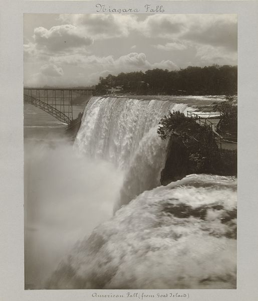 This is H.F. Nielson’s photographic image of Niagara Falls, printed as part of an advertisement for Gustav Boehm’s “Voyage Around the World” series. Niagara Falls in the late 19th century, was not just a natural wonder, but a spectacle molded by tourism and industry. This image captures that tension. We see the sublime force of nature, yet also the man-made structures that allowed for observation and commodification of the falls. The people at the top are a reminder of the site's accessibility and popularity. Consider too, the complex relationship between the European gaze and the American landscape. As Europeans traveled and settled in the Americas, iconic sites like Niagara Falls became symbols of both the allure and the exploitation of the New World. This image, circulated as part of a commercial venture, speaks to the intertwined histories of exploration, colonization, and the marketing of nature itself. It prompts us to reflect on how we frame and consume landscapes, and whose stories are told in the process.