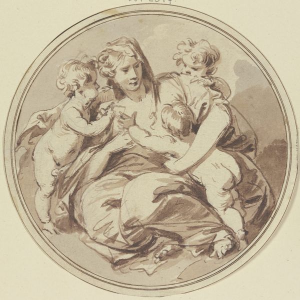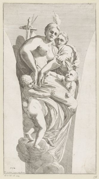 Curator: Here we have Pierre Alexandre Aveline’s engraving, "Three Loves Next to a Cartouche," created sometime between 1727 and 1760. It's a delightful example of Rococo aesthetics currently residing at the Metropolitan Museum of Art. Editor: Gosh, these cherubs are mischievous! It's pure, unadulterated fluff, like a sugared almond dissolving on your tongue. But with surprisingly sharp edges. Curator: The composition definitely embodies the era's penchant for asymmetry and playful themes. Aveline, trained as an engraver, cleverly reproduces the airy qualities you'd find in a Boucher drawing using fine, economical lines. Notice the texture variations he achieves to suggest depth and form. Editor: Precisely! You can almost feel the softness of their chubby little bodies contrasting with the rigid cartouche beside them, ready to receive whatever message—serious or frivolous—it’s destined for. It's funny how something so frivolous in subject can be incredibly serious in its technique. Curator: The choice of engraving – a meticulous, labour-intensive medium - elevates what might seem like mere decoration to a commentary on value, or perhaps labor itself. The reproductive print was designed for consumption beyond elite circles and made artwork accessible to many, despite the work required to produce the print. Editor: Indeed. These plump cherubs, cavorting near a blank cartouche – a space intended for grand pronouncements— feels delightfully absurd! They're interrupting art's grand plans with childish play. Makes you wonder about Aveline’s perspective—embracing the absurdity, maybe? Curator: That tension – between craft and consumerism, message and ornamentation – is what makes the piece so resonant. It allows for many interpretations; is it decoration or social critique? Ultimately, that ambiguity speaks to the complex realities of artistic production at the time. Editor: Well, I’m certainly adding this to my personal collection of delightful absurdities—at least in my mind's eye. Thanks for spotlighting its interesting blend of silliness and shrewdness.