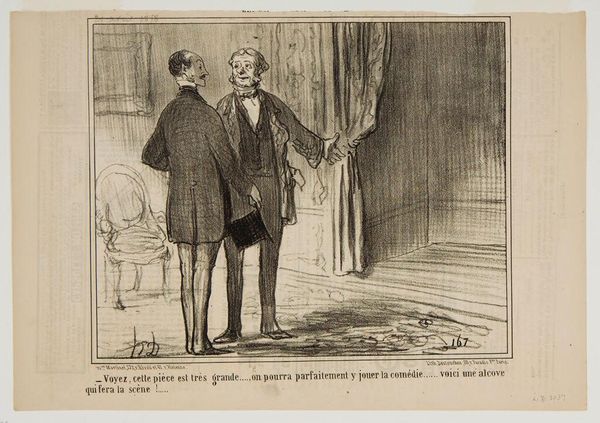 This lithograph by Honoré Daumier depicts two figures discussing the suitability of a grand room for theatrical performance, highlighted by the curtained alcove. The open gesture, the welcoming arm, isn't merely about space; it's an invitation to step into illusion. Consider how this gesture echoes in Renaissance paintings of the Annunciation, where the angel Gabriel extends an arm, offering divine news. Yet, here, the news is of a different order, an invitation into a social comedy. The curtain itself is a potent symbol. In ancient Greek theatre, curtains signaled transitions between acts, veiling and unveiling truths. Here, it conceals and reveals not divine revelation, but social play. It's a recurring motif throughout art history. The psychological draw of this stage is powerful, tapping into our collective desire for spectacle, for the uninhibited performance of self. This act of unveiling and performance is a cyclical pattern, a motif that resurfaces and evolves, forever tied to humanity’s stage.