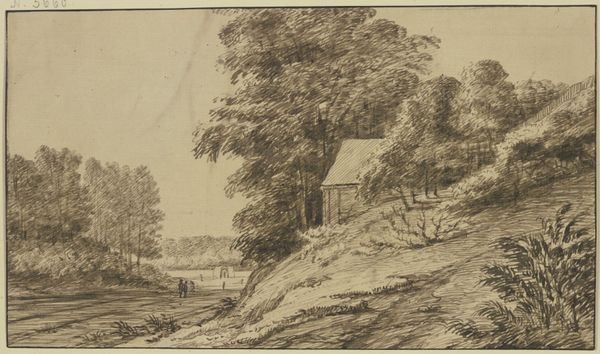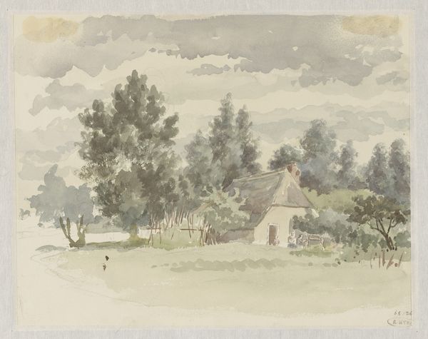 Here we see 'Cottages in an Extensive Landscape', a watercolor on paper created by William Henry Hunt. The work presents a rural scene dominated by soft, diffused light and gentle washes of color. The cottages, rendered with careful detail, sit nestled within the landscape. Hunt's composition reveals a keen attention to the interplay between architectural forms and the natural world. Note the use of watercolor: its fluidity allows for the depiction of atmospheric effects, like the cloudy sky, that blend into the distant hills. The cottages are more sharply defined, however, creating a contrast between the solid and the ephemeral. Hunt’s use of color and tone is carefully modulated, suggesting the subtle gradations of light. In its structure, the painting suggests a broader discourse, engaging with ideas of the picturesque and the sublime. Through his strategic placement of forms, Hunt creates an image that invites contemplation on our relationship with the natural world.