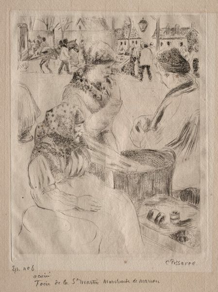 Camille Pissarro created this print called ‘Chestnut Vendors’ using etching, a printmaking technique that uses acid to cut into a metal plate. In late 19th century Paris, Pissarro, of Jewish-Portuguese descent, chose to depict working-class women, challenging the norms of bourgeois representation. Consider the social status of these women, marked by their labor and modest attire. This artwork captures a candid moment of their daily lives, revealing both the hardships and resilience inherent in their occupation. Pissarro’s choice of subject matter invites reflection on the intersection of gender, class, and labor in Parisian society. These women selling roasted chestnuts are not simply vendors; they are figures of strength who are contributing to the bustling urban economy. The artist elevates their status, acknowledging the often-overlooked contributions of working-class women. As you view this print, consider how Pissarro’s work provides a poignant commentary on the societal structures that shape our understanding of identity and worth.