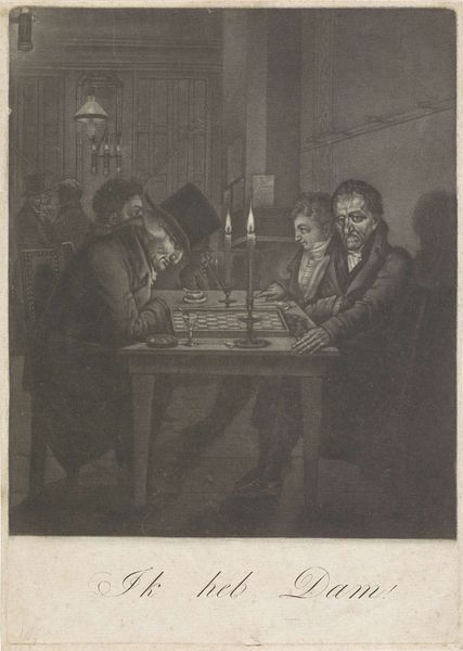 Curator: Ah, the eternal game, depicted in this lithograph and ink drawing, "Cinq coeurs, quinte et quatorze…," by Honoré Daumier from the 19th century. Immediately captivating, isn’t it? Editor: Absolutely. My first impression? Restless energy, but a kind of trapped energy, almost. Look at the lean of that figure, poised between argument and flight. Like a coiled spring about to burst. Curator: Daumier certainly knew how to capture a mood. The whole scene speaks to the social fabric, and in many ways the caricatures stand as potent symbols. The artist has perfectly rendered the nervous body language of the man in mid-speech versus the older man, who has just played his cards with such a resigned pose. Editor: Yes, notice the hand on the table – an attempt at calm perhaps? Then, what does card-playing signify here? Obviously gambling, but also chance, risk, veiled aggression? Do the suits reference anything in particular? There is more than money on that table for sure. Curator: Undoubtedly! Cards can stand for both fortune and folly, it has become a very well-recognized motif through time. This almost certainly mirrors the cutthroat political games being played at the time. Even the quick, restless line-work creates a sense of nervous excitement in this everyday scenario. And the text at the bottom! It looks like there's an admission of loss, an invocation of the devil, and a hurried exit. A tableau of mid-19th century anxiety. Editor: Beautifully put. This tension he conveys, it touches on universal anxieties really, especially within closed-door negotiations, financial and emotional stakes all tangled. What seems to be at play in the dark tones on this lithograph? The play of shadow against light amplifies the whole emotional depth in the drawing, it's almost claustrophobic in the way they fill the scene. It gives it a palpable air. Curator: Indeed. And in this context, Daumier seems to remind us how close we are from civility to utter despair. The light and shadow add layers of meaning; this work reminds us that time does not change, only recycles the symbolic narrative. Editor: You're so right. I leave with an even stronger appreciation.