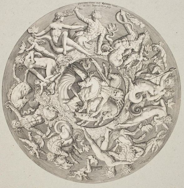 D. Ste Taborotius created this circular allegorical work on folly and drunkenness. The piece reflects the carnivalesque spirit often found in art that critiques social norms through satire. A jester, emblematic of the period's tolerance for the subversion of authority, plays his instrument atop a figure who seems to be carrying the world upside down. This role reversal speaks volumes. It suggests a world where order is inverted and rationality is mocked, revealing how easily hierarchies can be upended, and societal structures questioned. The text encircling the image only adds to the topsy-turvy nature of the scene, emphasizing the ephemeral nature of sobriety and reason. The image serves as a mirror, reflecting the viewer's own potential for folly and inviting contemplation on the precarious balance between wisdom and foolishness.