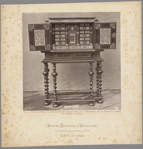 This photograph shows a display of a cabinet and table, made of ebony and inlay, as shown at the German Exhibition in Munich in 1876. Ebony, prized for its dense, dark grain, has long been associated with luxury. Sourced from tropical regions and requiring skilled craftsmanship, it immediately signals wealth and refinement. The meticulous inlay work, precise joinery, and polished surfaces all indicate a substantial investment of time and skill. Note the contrasting light inlays against the dark ebony, creating intricate patterns. The cabinet features detailed carvings of classical figures, further enhancing its preciousness. These are not simply functional pieces of furniture; they are displays of status. They were conceived to impress viewers with the owner’s wealth and refined taste. Ultimately, we can understand this display of craftsmanship and material as a reflection of the social hierarchies and aspirations of 19th-century society.