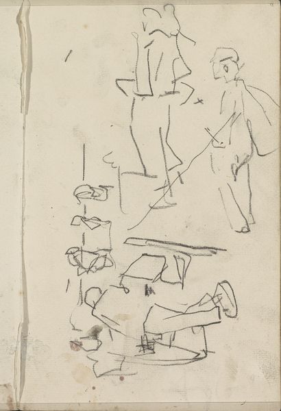 Curator: Editor: Welcome to the Rijksmuseum. Here we have Isaac Israels' "Studies van een vrouw die schoonmaakt," a pencil and ink drawing on paper, created sometime between 1886 and 1934. I’m struck by the sheer number of poses captured. It really emphasizes movement, but in a quotidian, almost anonymous way. What’s your take on this piece? Curator: For me, the power of this piece lies in its depiction of labor. Israels gives us multiple views of a woman engaged in the act of cleaning. Note the repetition of buckets and scrubbing motions. It pulls back the curtain to reveal domestic labor as work, not just a condition. How does the material of the sketch itself, the quickly rendered lines, speak to the labor being represented? Editor: I see what you mean. It's not idealized at all; it's raw and immediate. Almost like the viewer is intruding upon a private moment. Are you suggesting Israels is making a commentary on the working class through his choice of subject matter? Curator: I think he's presenting the labour. The hasty sketches suggests the fast and repeated movement, the physical realities of working class life without sentimentality. Do you see the tension between the traditional fine art setting of a drawing and the humble subject it depicts? Editor: Absolutely. It's as if Israels is deliberately blurring the line between what's considered worthy of artistic representation and the everyday reality of many people. It almost feels like an early form of social realism, brought down to a very human scale. Curator: Exactly. He is valuing labor itself by documenting the material conditions of daily life and giving us insight to the lives of others. Israels directs our gaze towards the means of survival. How does it make you reconsider our interaction with labor? Editor: This was an interesting way to observe the artist's choices in presenting this figure! I will be pondering this work more. Curator: I hope you and others will think more critically about artistic representations and labor now!