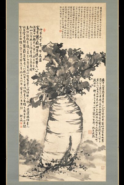 Editor: This is Utagawa Hiroshige's "Duck and Bamboo." The monochromatic palette gives it a calm, almost meditative quality. What do you see in this piece beyond its simple depiction? Curator: For me, it whispers of fleeting moments. Hiroshige often captured the ephemeral beauty of nature, didn't he? The duck, nestled amongst the bamboo, feels like a snapshot of a tranquil world, momentarily caught in ink. Do you get a sense of the quiet stillness? Editor: Yes, definitely. The contrast between the intricate bamboo leaves and the smooth, curved lines of the duck also adds to the visual interest. I'm starting to appreciate the depth within this seemingly simple composition. Curator: Exactly! It's a reminder that beauty often lies in the quiet observation of the natural world. Editor: It's like a poem, a visual haiku.