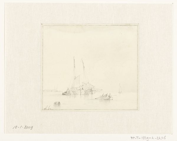 Curator: Welcome. Today we're observing Andreas Schelfhout's "Coastal View with Several Boats on the Beach," believed to have been created sometime between 1797 and 1870. Editor: It has a lovely, subdued feel, almost ethereal. The limited use of pencil lends itself well to the tranquil coastal scene, with that hazy background. Curator: Schelfhout, as a landscape artist, was profoundly interested in the Dutch countryside and coastline. Works like this reflect the Romantic movement’s fascination with nature, though Schelfhout adds his touch of realism in everyday coastal life. Editor: What I appreciate is the visible labor embedded here. It's not just pretty boats; it's the presence of people, implied livelihoods. These boats signify fishing and transport; industries deeply intertwined with the lives of the coastal inhabitants. What material choices drove Schelfhout's process? Was paper readily available, or was its accessibility evolving in ways that influenced production? Curator: Schelfhout's drawings and paintings were popular and plentiful. He belonged to artist societies and exhibited regularly; and in that light we can view it as something produced within an art market geared toward middle-class taste. Editor: Interesting—a mass produced object with hints to working-class reality. It’s easy to overlook the pencil itself, and its mass manufacturing which made drawing accessible, or etchings to be reproduced. Even within "high art", industry lurks. Curator: And in turn this reflects a Netherlands grappling with its identity in the wake of major social and political change. Looking at images like these can become valuable documents into how artistic tastes shaped views of labor. Editor: Precisely, an idyllic facade painted upon real and very complex industry, material production and, likely, a lot of social strife. I enjoy seeing the trace of pencil, that visible labor and how accessible image creation truly became. Curator: By observing Schelfhout's "Coastal View," we see more than just an artist depicting his landscape. It opens an entire narrative that shows social status in its day. Editor: A seemingly quiet harbor scene offers surprisingly layered insight when you examine the hand and the material creating it!